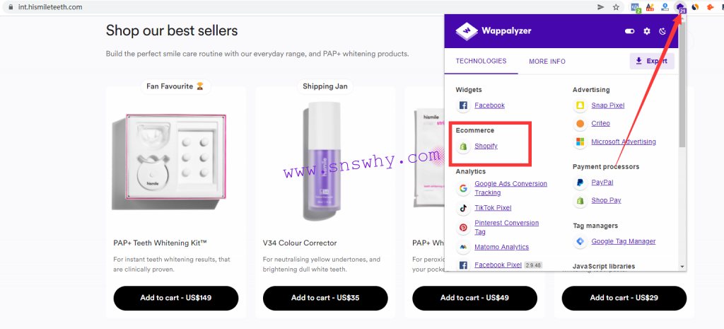 这个wappalyzer插件除了检测系统以外,还可以看到对方网站装了哪些跟踪代码以及facebook pixel像素编号,这样对于卖家也可以做一个参考,你的网站是否也可以在相同的平台去做推广引流。